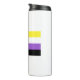 A bandeira não-binária foi criada em 2014 pelo ativista Kye Rowan. Cada cor de faixa representa diferentes tipos de identidades não-binárias: Amarelo para pessoas que se identificam fora do binário de gênero, branco para pessoas não-binárias com múltiplos gêneros, roxo para aqueles com uma mistura de gêneros masculinos e femininos e preto para indivíduos agendantes.