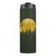 Esta design estética retrata uma cena na floresta noturna em ótimas cores douradas com uma árvore e silhueta florestal e uma lua crescente.