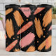 Esta imagem apresenta um padrão uniforme composto por traçados de pincel de abstrato e partículas de brilho espalhadas em um fundo preto sólido. As pinceladas são predominantemente em tons de laranja, coral e rosa, com textura visível e bordas onduladas, sugerindo um toque pintado à mão. Os pequenos pontos irregulares de brilho em cores complementares são aspergidos por todo o design, adicionando um efeito cintilante.