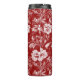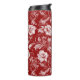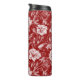 Este tumbler térmico apresenta um padrão floral barroco em branco sobre vermelho.