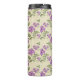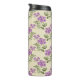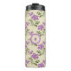 Tumbler térmico com padrão floral amarelo pálido e lilás e um monograma de uma letra.