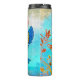 Este lindo design retrata um pássaro azul e dourado fazendo uma aterrissagem em uma árvore ouro com um belo céu de muitas cores azuis e um sol laranja ousado.