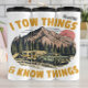 Este gráfico inspirado na safra apresenta um caminhão clássico que levava um trailer de viagem através de uma floresta serena, contra montanhas majestosas e uma ascensão ou pôr o sol. O texto ousado e angustiado "I TOW COISAS & KNOW COISAS" transmite uma atitude confiante e experiente sobre aventuras ao ar livre, incorporando um amor por acampar e viagem.
