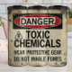 Este angustiado sinal de aviso no estilo de vintage apresenta com destaque "PERIGO". em uma faixa em negrito vermelho e preto. Abaixo, um símbolo de perigo acompanha "TOXIC CHEMICALS" em letras grandes. O sinal também instrui "ARTES PROTETORAS VESTIDAS" e "NÃO INVENTAR FUMES", todos colocados contra um fundo curado e enferrujado, enfatizando precauções críticas de segurança.