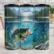 Esta é uma ilustração detalhada e realista que é dividida em duas visões: acima e abaixo da água. Acima da água, um lago sereno é cercado por uma floresta de pinheiros e montanhas sob um céu brilhante e ensolarado. Abaixo da água, um grande peixe-robalo com a boca aberta está prestes a morder uma isca de pesca verde vibrante. A cena submarina está repleta de água límpida e cristalina, pedras lisas, várias plantas aquáticas e peixes menores. A luz solar penetra na água, criando um efeito atordoante e semelhante à vida.