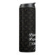 Este tumbler térmico apresenta o texto "Grades, vestido, Graduação" com um fundo de bonés de formatura. você pode personalizar e colocar o nome do formando.