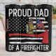 This is a powerful, patriotic design for the father of a firefighter. The central image features a firefighter in full gear, including a helmet and air tank, holding an American flag on a pole. This image is overlaid on a distressed, black and white US flag background. A large, stylized red axe forms the base of the image. The text "PROUD DAD OF A FIREFIGHTER" is split across the top and bottom in a bold, distressed font. A customizable name, "Theodore", is on the left side.