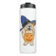 Whimsical cartoon dog in a wide wizard hat carries a glowing jack-o'-lantern. Bold lines, warm autumn colours, Halloween vibe, ideal for playful apparel and festive gifts.