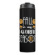 A pequena abóbora marrom, cogumelo, e as ilustrações das botas-de-chuva e o grande texto: Queda é a minha estação favorita.