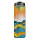 Cena de paisagem abstrato de uma zona de montanha com colinas rolantes e uma tempestade de chuva em laranja, ouro, azul e ciano.
