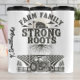 Esta é uma design gráfica rústica com um tema de fazenda. A imagem central apresenta um celeiro clássico com moinho de vento. Um sistema de raiz é visível abaixo do celeiro e as frases "FAMÍLIA de FAZENDAS" e "RAIOS FORTES" são exibidas acima e abaixo da cena em uma fonte em negrito e meteorizada. Abaixo, aparece um trator num campo lavado com cerca e feixes de trigo.