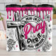 Este gráfico arrojado apresenta "Reze" em rosa-quente brilhante, rodeado pelas frases "PRAY ON IT", "OVER IT" e "PRAY THROUGH IT". Uma cruz preta angustiada está bem ao lado do texto. O fundo é branco com contornos de rosas e estrelas, erguidos por uma borda rosa pingando, enfatizando uma forte mensagem de oração persistente.