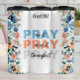 Este gráfico espiritual apresenta a poderosa mensagem "PRAY on it / PRAY over it / PRAY through it" em letras negrito e coloridas em blocos e um roteiro elegante. O texto central é belamente enquadrado por bordas verticais esmagadoras de flores azuis e pêssego, ao estilo aquoso, com folhas verdes. Colocado sobre um fundo branco limpo, o design oferece estímulo sereno para uma oração rápida.