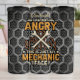 Este gráfico apresenta uma frase humorística para a mecânica: "EU NÃO ESTOU ZANGADO ESTE É APENAS O MEU ROSTO MECÂNICO". É colocado contra um fundo escuro e industrial de malha hexagonal. O texto está estilizado em cor laranja e branca, com chaves e engrenagens cruzadas, criando um design ousado e relacionado para profissionais automotivos ou entusiastas.