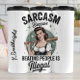 Esta ilustração do estilo vintage apresenta uma mulher com um sorriso confiante, segurando um taco de baseball sobre o ombro. A arte tem um estilo retrô, pin-up. O texto no topo e no fundo diz: "SARCASM Porque BEATING PESSOAS É Ilegal", dando ao design um sentimento muito humorístico e ousado.