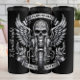 Essa imagem ilustra detalhadamente a frente de uma moto, com o crânio como ponto focal, flanqueado por asas metálicas grandes e cercadas por chamas estilizadas. Bandeiras com o texto "SEM PLANOS. SEM MAPAS. SEM GPS." e "SEM REGRAS. JUST RIDE" transmite uma mensagem de liberdade e espontaneidade. O design é monocromático, dando-lhe um emblema clássico, ousado ou tatuagem.