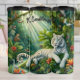 Esta é uma ilustração detalhada e vibrante de um tigre branco descansando pacificamente numa selva verde e exuberante. O tigre, com as suas riscas brancas e castanhas e os olhos verdes marcantes, é o centro, rodeado por uma variedade de flora e fauna coloridas. A cena inclui uma variedade de animais exóticos como macacos, tucanos, papagaios e uma grua branca. A selva é iluminada por veios de luz que se rompem pela densa folhagem, criando uma atmosfera mágica e serena.