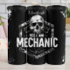 Este gráfico monocromático apresenta um crânio estilizado no topo, posicionado acima da declaração ousada "SIM EU SOU MECÂNICO". O texto é emoldurado dentro de uma borda geométrica industrial que se assemelha a uma placa metálica aparafusada, contra um fundo escuro e angustiado. O design geral transmite uma identidade robusta e orgulhosa para um mecânico, enfatizando sua profissão com uma forte declaração visual.