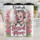 Esta ilustração branca apresenta um adorável porco de desenho animado, vestindo um chapéu branco e preto, segurando um grande sinal branco. O cartaz está rodeado por delicadas flores cor-de-rosa e folhagem verde. O texto na placa, escrito em na moda, diz "Bênçãos à Mãe" em cor muito lata, com pequenos corações, criando um doce e charmoso tributo.