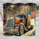Esta imagem apresenta um estilo de vintage, semircaminhão estacionado em cobre, dentro, um celeiro de madeira rústico. O caminhão tem sotaques cromados e um design clássico. Ao fundo, uma bandeira americana pendura de forma proeminente, parcialmente obscurecida pela porta aberta do celeiro, que permite a luz brilhante do dia. A cena evoca um senso de Americana e patrimônio clássico de caminhoneiros.