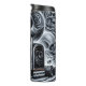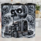 Essa imagem monocromática apresenta um poderoso caminhão preto com detalhes estilizados e giratórios de prata, colocados contra um pano de fundo de fumaça branca fantasmagórica e inúmeros crânios ameaçadores de tamanhos variados. Os crânios parecem emergir da névoa enfumaçado, criando uma atmosfera escura e gótica ao redor do caminhão.