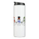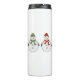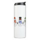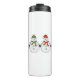 Três bonitinhos bonitos homens de neve vestindo lenços e cada um com uma roupa especial decorada. Um chapéu de Papai Noel, um gorro e um chapéu.