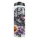 Uma loja feliz da Baía de Chesapeake com a língua para fora é posicionada alegremente entre uma mistura vibrante de girassóis, púrpuros e outras flores coloridas silvestres. As borboletas se espalham, acrescentando um toque caprichoso a este brilhante e alegre retrato floral da raça energética.