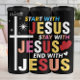 This colorful and encouraging design features "START WITH JESUS STAY WITH JESUS END WITH JESUS." Each "JESUS" is depicted in a different vibrant color (red, pink, yellow) and font style, accompanied by stars and hearts, all next to a prominent white cross, emphasizing Christ as the center of one's life journey.