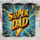 Este gráfico dinâmico exibe poderosamente "PAI SUPER" em letras em negrito, ouro, efeito 3D. As palavras são colocadas contra um fundo azul vibrante, estalando com raio amarelo intenso e nuvens tortuosas e tortuosas. Esta design impressionante evoca uma sensação de força heroica e apreciação, perfeita para celebrar um pai incrível.