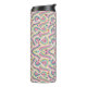 Tall, insulated travel mug with intricate, colorful geometric patterns in pink, blue, green, and yellow. Black lid contrasts with vibrant design.