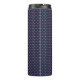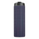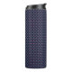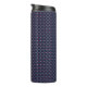 Tall insulated tumbler with a black lid, featuring a geometric pattern of pink and teal dots on a dark background, creating a vibrant and modern look.