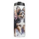 Uma ilustração deliciosa de uma raposa de brinquedo feliz terrier em meio a elegantes girassóis e rosas. O contraste do filhote vibrante com os tons florais mutados cria uma composição charmosa e na moda, perfeita para amantes de cachorros e de arte floral.