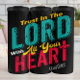 This inspiring design declares "Trust In The LORD With All Your HEART." "Trust In The" is in yellow, while "LORD" is prominent in a distressed teal font. "All Your" flows in yellow script, and "HEART" is bold in red with a texture and a small cross, emphasizing complete reliance on divine guidance.