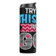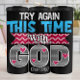 This motivational design encourages "TRY AGAIN THIS TIME With GOD." "TRY AGAIN" is in a distressed white, and "THIS TIME" is a bold blue. "With" flows in a script over a pink wavy banner, and "GOD" is prominent with a white plaid pattern and red hearts, emphasizing divine partnership in new attempts.
