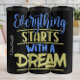 Este gráfico apresenta uma citação inspiradora em uma mistura de fontes em negrito e script, definida em um fundo preto sólido. A palavra "Tudo" está em um roteiro azul claro no topo. Abaixo dele, "STARTS" está em uma fonte de bloco em negrito e amarelo, seguida por "WITH A" em uma fonte de bloco azul claro, e finalmente, um grande e proeminente "DREAM" em uma fonte de bloco amarelo. Linhas horizontais amarelas finas enquadram o texto.