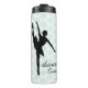 Tumbler térmico do dançarino feito em fundo de cor damasco verde e branco de menta clara, com gráficos de uma silhueta preta de uma dançarina de balé decorando a frente central. Personalize o texto preto para si mesmo ou como uma ideia de presente de excelente para a sua dançarina favorita.