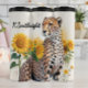 Esta bela ilustração retrata um guepardo com uma expressão serena, sentada calmamente em meio a um campo de girassóis. Os girassóis são transformados em amarelos quentes e castanhos, complementando o casaco de guepardo. A arte tem um estilo suave, caprichoso e natural que combina a vida selvagem com um belo cenário floral.