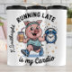 Esta ilustração humorística apresenta um porco atleta giro numa roupa azul de treino, segurando uma xícara de café e um despertador de toque. O porco tem uma expressão alegre e determinada enquanto corre. O texto no topo e no fundo diz, "RUNNING LATE é meu cardio," dando à arte uma sensação muito engraçada e relacionável.