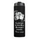Uma foto vale mil palavras da caneca de viagem Tumbler do fotógrafo. Design de caneca de café preto e branco personalizada com aspas inspiradoras e câmera em desenho de foco. Personalize com seu próprio texto e imagem opcionalmente. Ideias de presente únicas para fotógrafos, colegas, patrões, profissionais, hobbyistas, etc.
