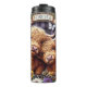 Esta é uma ilustração emocionante e caprichosa que inclui dois adoráveis, fofos bezerros de terras altas abraçando-se uns aos outros. Os vitelos estão rodeados por uma coroa floral com flores coloridas e borboletas, e o fundo é um padrão de gingham preto e branco. Coloca-se sobre os vitelos uma faixa com a palavra "FOREVER". A imagem inteira exude um senso de calor, amor e beleza natural.