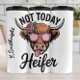 Esta ilustração engraçada mostra uma vaca marrom e cabeleira Highland vestindo óculos escuros de ponto de polca rosa e um rosa atrás de seu chifre. A língua da vaca está se destacando e o texto no topo e na base lê, "NÃO HOJE Heifer", dando à arte uma sensação muito humorada e infeliz.