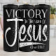 This powerful black and white design proclaims "VICTORY In The Name Of Jesus." "VICTORY" is bold and distressed, while "Jesus" is the dominant feature in a large, flowing script with a speckled texture, creating a strong statement of triumph through faith.