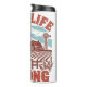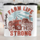 Esta é uma design gráfica rústica com um tema de fazenda. A imagem central apresenta um trator vermelho clássico e um celeiro vermelho tradicional com moinho de vento. A cena é colocada num campo arado com cerca de madeira e cercada por feixes de trigo. As frases "LIFE FAZENDA" e "FORTE" são exibidas de forma destacada, acima e abaixo da cena, em caracteres em negrito, meteorológicos. O fundo é um céu com nuvens e raios solares.