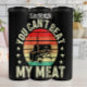 Este gráfico apresenta um design humorístico com uma silhueta de fumante contra um pôr do sol retro listrado. O texto 'VOCÊ NÃO PODE BATER MINHA CARNE' está em uma fonte ousada e angustiada, criando um gráfico simples e espirituoso perfeito para um entusiasta do churrasco ou mestre de grelhas.