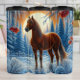 A beautiful brown horse stands serenely in a snow-covered forest as the warm light of the setting sun glows behind the trees. Icicles hang from branches, and red berries add pops of color to the otherwise cool, peaceful winter landscape.