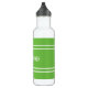 Garrafa de água branca e verde, com listras e um nome.