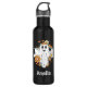 Garrafa de água com uma ilustração de um fantasma sorridente. Decorado com flores, arco-íris e morcegos.