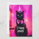 Junte-se a nós para uma alegre celebração do Ano Novo com um cartão de convite casual mostrando um trabalho de arte de fantasia animado! Um gato preto na moda com um chapéu pontiagudo e gravata arco roxa está esportivando um olhar de jazz, acompanhado pelo texto "Happy 2025" e uma citação engraçada do outro lado: "Feline good about the year next—vamos party!" Perfeito para quem gosta de gatos e ri bem!