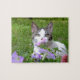 Tigre bonito e gatinho branco e petúnias rosa/roxo neste quebra-cabeça