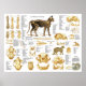 Poster de anatomia do esqueleto de gato, A tabela de parede mostra a estrutura esquelética do gato. Vistas do crânio com detalhes dos dentes. Vista plantar e dorsal dos ossos da pata traseira e da pata dianteira com anatomia superficial. Coluna espinhal, jaula de costelas e bacia. Ligações do algarismo que mostram a ação da garra.